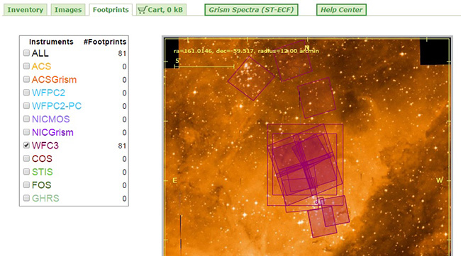 Choisissons par exemple HH901 et on clique sur "search", puis sur l'onglet "Footprints" pour choisir notre camera "WFC3"
