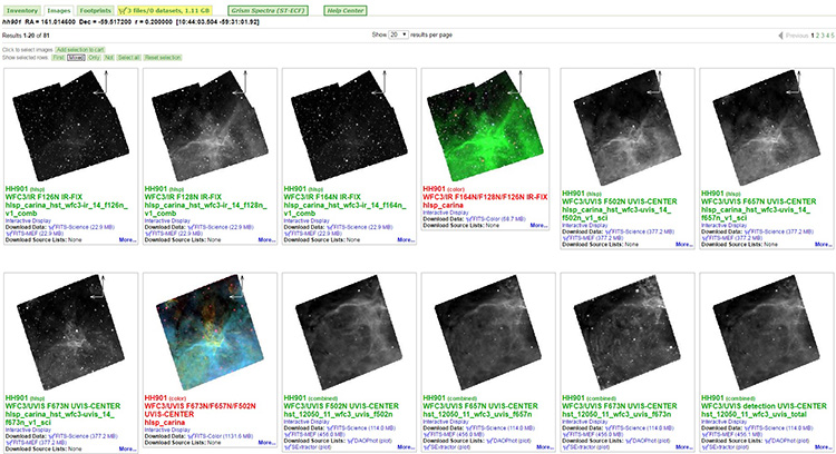 Vous voyez alors différentes images qui sont nommées par le nom de la caméra WFC3 puis par la longueur d'onde du filtre. De façon à faire simple, nous allons simplement télécharger les images dont les longueurs d'onde se trouvent dans le visible, les trois filtres permettant le traitement du désormais légendaire "SHO", un traitement en trichromie, en fausse couleur selon la palette de couleur Hubble.