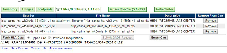 On télécharge donc ces trois fichiers en cliquant sur le caddie FITS-Science sous chacune des trois images qui nous intéressent puis on se rend sur l'onglet de téléchargement qui indique "3files/0datasets, 1.11GB" et enfin, on clique sur "Fetch HLA Data" pour télécharger nos trois images .