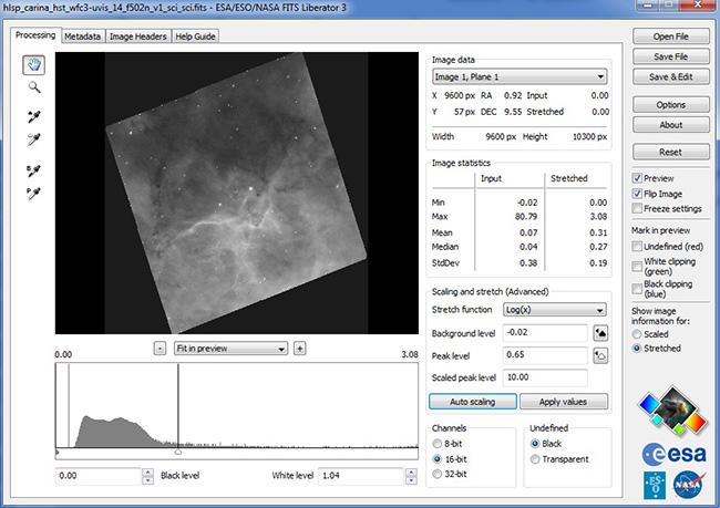 Une fois téléchargé et dézippé, vous aurez trois fichiers correspondant aux troix filtres. Nous allons devoir ouvrir chacune des images avec le logiciel téléchargé au préalable, Fits Liberator, et faire un premier réglage des niveaux en choisissant un algorythme, Log(x) par exemple. Il ne reste plus qu'à enregistrer l'image en Tiff, faire de même avec les deux autres images et enfin, les ouvrir sous photoshop ou autre logiciel de traitement d'image afin d'attaquer le traitement à proprement parlé.