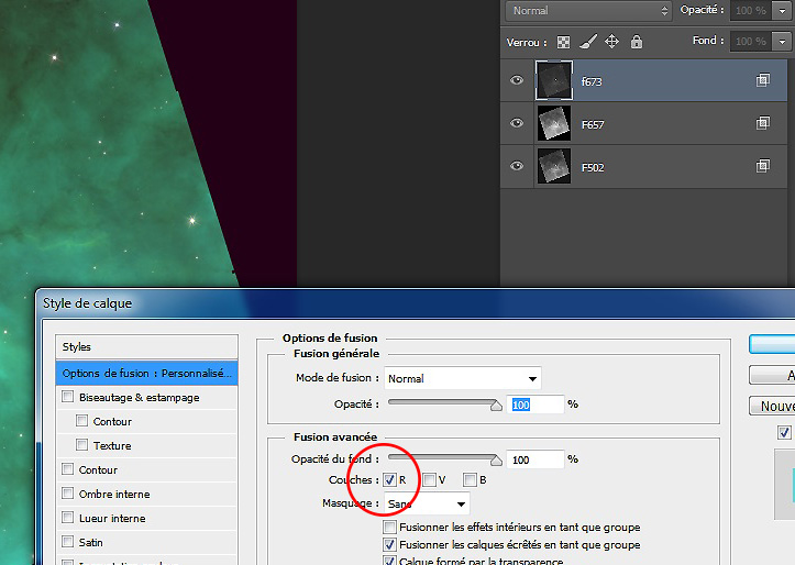 Enfin, sur chacun des calques superposés, choisir la couche couleur correspondant à la longueur d'onde voulu (F673: Rouge - F657: Vert - F502: Bleue) en double cliquant sur chacun des calques.