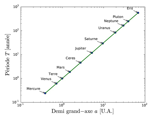 La troisième loi de Kepler dit que le carré de la période sidérale notéeT, c'est-à-dire le temps entre deux passages successifs devant une étoile est directement proportionnel au cube du demi grand axe a de la trajectoire elliptique de la planète.