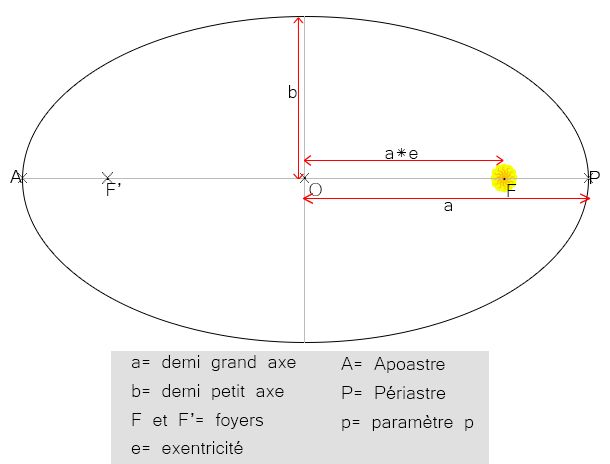 Une ellipse est caractérisée par deux constantes, le paramètre (e), l’excentricité, c'est-à-dire le degré d’aplatissement et le paramètre (p) qui est une constante et défini sa taille sans affecter la forme. On appelle demi grand axe (a) le plus grand de ses demi-diamètres et demi petit axe (b), le plus petit demi-diamètre de l’ellipse.