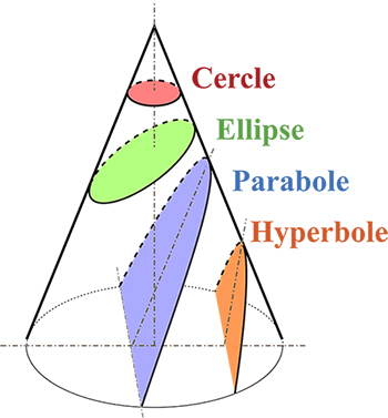 Une conique est une figure géométrique obtenu par l'intersection d'un cône par un plan. Ce plan peut être placé en plusieurs endroits :