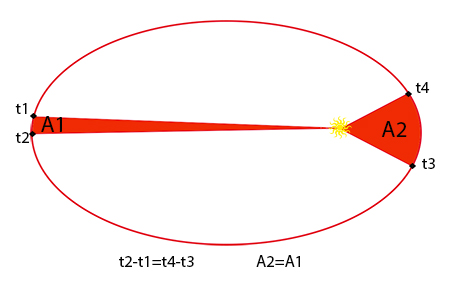 La deuxième loi de Kepler dit qu’au cours du mouvement orbital, le rayon-vecteur joignant les centres du Soleil et d’une planète, balaie des aires égales en des temps égaux. C'est à dire que en une durée donnée, l’aire balayée est toujours la même, quelque soit la partie de l’orbite sur laquelle on se trouve.